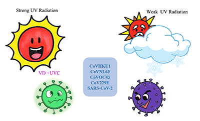 论文采用Spearman和Kendall秩相关分析方法,对5种人类冠状病毒(SARS-CoV-2、CoVHKU1、CoVNL63、CoVOC43和CoV229E)进行了大数据分析,结果表明,4种常见冠状病毒的月平均阳性率与太阳紫外线辐射剂量呈显著负相关。2020年4月17日至7月10日,美国SARS-CoV-2周阳性率与美国第一、二普查区太阳光紫外线辐射剂量呈显著负相关。此外,太阳紫外线辐射对SARS-CoV-2的早期传播也有一定的负面影响。