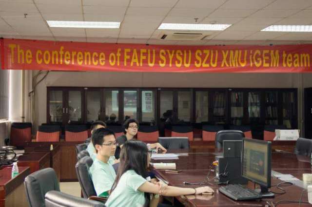 这次交流会议由SZU-iGEM组织,其余三个队伍到场的人员是他们各自来深圳参加合成生物学会议的代表们,分别是中大队长1人、福农队长1人、厦大队员2人。