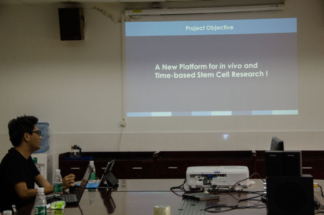 其次,中大带队的队长从容地给介绍着他们的passbom,具体来说是做一个干细胞导入生物体后,其分裂分化继代数的检测以及去向的追踪系统,通过不同荧光蛋白表达实现检测目的。pre过程的逻辑性很强,并且会通过抛出问题并自己回答问题的方式去梳理整个项目的晦涩难懂之处,同时队员们需要学习的是他们对自己项目的熟悉了解程度及PPT制作与演讲稿的配合度。
