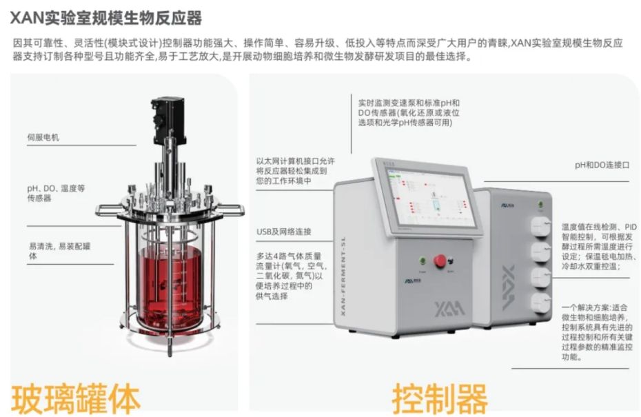生物反应器是通过提供适宜的反应条件(如温度、pH、溶氧等)来促进细胞和微生物等的生长和代谢,从而生产目标产物的设备,主要用于菌种生理特性研究,通过高性能细胞株或摇瓶获得细胞后,在发酵罐内精准控制温度、转速、通气、pH、DO 等参数,获取菌体基本生理特性,能够显著的提升菌体和目标产物的产量。