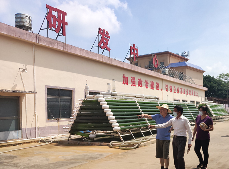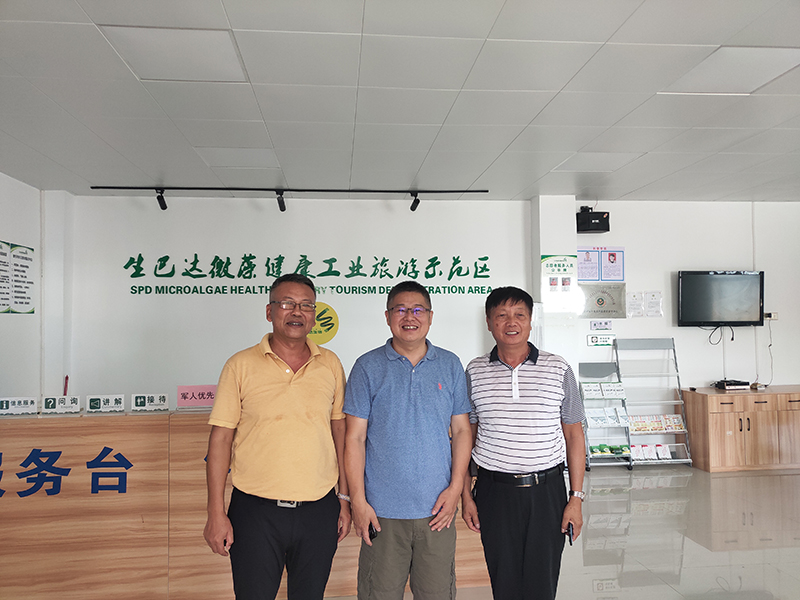 随后项目组走访了微藻生物技术企业。北海生巴达生物科技有限公司拥有现代化生产工艺的螺旋藻及小球藻生产基地,占地面积约20万平方米,年产优质微藻可达400吨。薛命雄总经理带领项目组成员参观了生巴达有限公司的研发中心、微藻健康产业旅游示范区、微藻养殖基地及微藻科普教育基地。