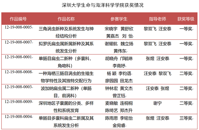 深圳大学生命与海洋科学学院师生在本次竞赛中表现出色,获全国创新类一等奖3项,全国创新类二等奖3项,全国创新类三等奖1项(具体见下表)。特向获奖的学生和老师表示祝贺!