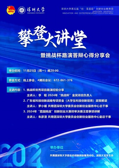 为增进师生对广东省科技创新战略专项资金(大学生科技创新培育)(以下简称“攀登计划”)的了解,引领广大青年学子积极投身科技创新实践,特举办“创∙享荔园”深圳大学第五届创新创业教育周——2024年攀登大讲堂暨“挑战杯”路演答辩心得分享会,解读攀登计划政策重点与具体内容、分享“挑战杯”路演答辩经验,并针对今年“荔园挑战”创新创业大赛终审决赛相关事项进行介绍