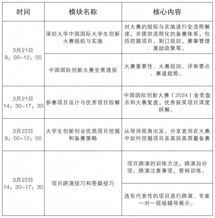 为深入贯彻落实全国教育大会及《国务院办公厅关于进一步支持大学生创新创业的指导意见》 (国办发﹝2021﹞35号)和《广东省教育厅2024年学生就业创业工作要点》等相关文件精神,积极深化我校创新创业教育改革,着力加强创新创业教育师资队伍建设,全面提升教师创新创业教学能力和创新创业大赛教师指导服务水平,搭建师资沟通交流平台,创新创业教育中心、共青团深圳大学委员会联合教师教学发展中心拟于2025年3月21日-22日举办中国国际大学生创新大赛(2025)深圳大学双创师资培训。