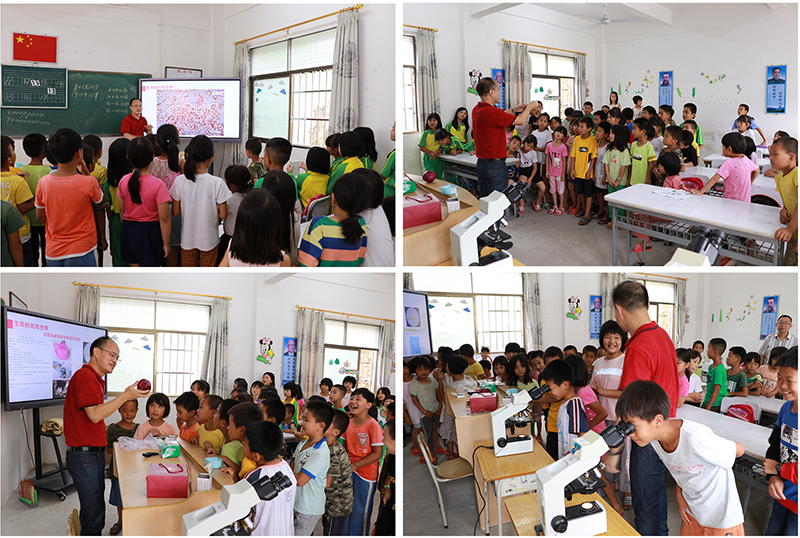 之后来到曲潭小学,张建华博士给全校小学生们上了一堂《走进看不见的微观生物世界》科普实验课,张老师从“我们的手真的干净吗?”、“吃了不干净的东西为什么会肚子疼?”等贴近孩子们生活的问题着手,让孩子们了解病毒、细菌、细胞等微观生物世界,认识生命现象,尤其在新冠疫情期间养成良好的生活卫生习惯。同时,利用从学院实验中心带来的显微镜,进行了观察洋葱表皮细胞的演示实验。孩子们专心听讲、踊跃发言,在显微镜下认真观察,认识奇妙的植物细胞。这堂科普课让孩子们从微观角度去了解世界,开阔视野和思维,提升想象空间,培养专注力和观察力,激发孩子发现生活科学的兴趣,让孩子们热爱学习。“扶贫先扶志、扶贫必扶智”,希望孩子们通过显微镜看到的不仅仅是细胞,更是多彩的人生、美好的未来!