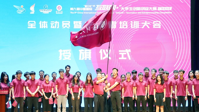 毛军发校长在动员会上为参赛选手授旗 自本届大赛启动以来,深圳大学累计8596个项目(高教6899,红旅1474,产业223)报名参赛,参赛学生超3万人次,创历史新高;经过多轮校内选拔比拼,共有39支队伍成功晋级广东省决赛,其中高教主赛道代表队23支、红旅代表队8支、产业赛道代表队8支合计,晋级率高达到81.25%,刷新九届以来广东省高校入围“互联网+”大赛省决赛项目数的记录! 衷心感谢广东省教育厅和深圳市人民政府等各级领导的信任支持,中国建设银行广东省分行的冠名赞助,省高等学校毕业生就业促进会的大力加持,学校领导的高度重视,各部门学院的通力合作,合作公司的高效配合,参赛师生的全力备赛,评委老师的专业工作,600多名志愿者师生的辛苦付出,大赛工作专班和创新创业教育中心老师无数个日日夜夜的艰苦作战和全力以赴。