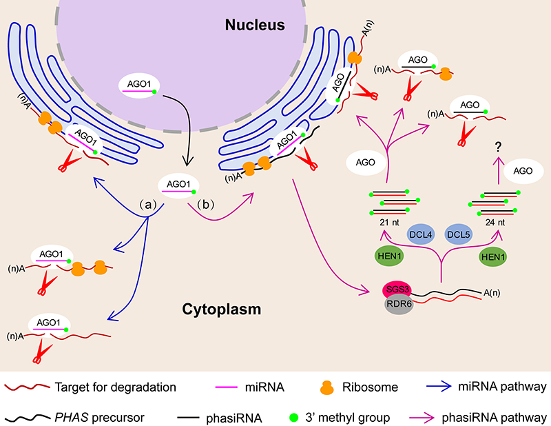 植物Small RNA(sRNA)是一类长度为21 nt ~ 24 nt的小片段RNA,在植物的生长、发育、生殖以及逆境响应等过程中发挥重要的调控作用。植物sRNA的主要分为siRNA和miRNA两大类,其中siRNA中包含了一类相位siRNA,即phasiRNA,这类siRNA与植物生长、发育、抗病及育性等密切相关。目前已知植物miRNA和siRNA可通过转录和转录后基因沉默发挥其调控作用,但是关于它们亚细胞定位的研究甚少,限制了人们对于sRNA作用机制与功能的理解。
