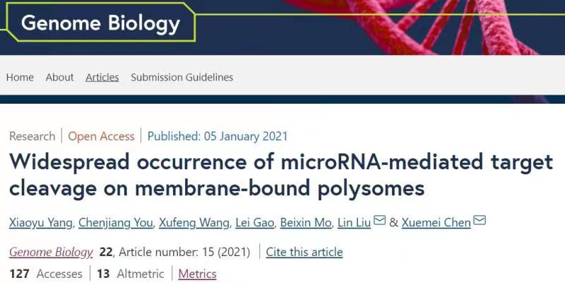 2021年1月5日,《Genome Biology》(中科院大类1区,5年影响因子19.041)在线发表了深圳大学生命与海洋科学学院刘琳副教授与加州大学河滨分校陈雪梅院士合作,题为“Widespread occurrence of microRNA-mediated target cleavage on membrane-bound polysomes”的研究论文。