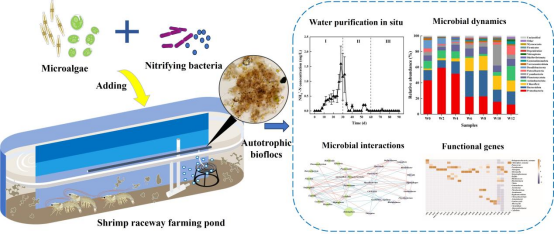 微藻自养型生物絮团与依赖额外有机碳补充的异养型生物絮团相比,展现出更低的能耗、更高的环保性及成本效益。然而,目前对微藻自养型生物絮团的构建、微生物群落组成和功能研究尚少,这限制了其在水产养殖行业的广泛应用。本研究通过添加混合微藻,包括硅藻门(Phaeodactylum tricornutum, Chaetoceros gracilis, Halamphora coffeaeformis) 和绿藻门(Chlorella vulgaris, Nannochloropsis oceanica, Graesiella emersonii) 以及驯化的硝化细菌 (Nitrospira sp., Nitrobacter sp., Nitrosomonas sp.)来促使微藻自养型生物絮团的形成,并在对虾养殖过程中分析其净水性能和微生物群落的动态变化。结果显示,在持续12周的中试规模对虾养殖过程中,微藻自养型生物絮团成功地控制了氨氮和亚硝酸盐的浓度,即使在碳氮比降至2.0的条件下,仍可保持在对虾生长的安全水平。微生物群落分析显示,微藻自养型生物絮团主要由原核生物变形菌门(Proteobacteria)、拟杆菌门(Bacteroidota)和绿弯菌门(Chloroflexi),以及真核生物硅藻门(Bacillariophyta)、轮虫门(Rotifera)和纤毛虫门(Ciliophora)组成。养殖4周后,微藻自养型生物絮团中的变形菌门和轮虫门丰度显著减少,拟杆菌门、绿弯菌门和硅藻门成为主导群落。细菌和微藻的协同作用促进了氮代谢,尤其是硝化螺旋菌属(Nitrospira)与双眉藻属(Halamphora)之间的正向互作,这为微藻自养型生物絮团的硝化功能形成提供了重要的生物学依据。宏基因组学分析进一步确认了微藻自养型生物絮团中与碳、氮和磷循环相关的关键细菌和完整的功能基因。这项研究将有助于推动微藻自养型生物絮团在低碳对虾养殖中的应用和发展。