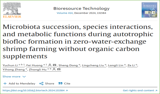 2024年10月16日,深圳大学生命与海洋科学学院胡章立讲席教授团队在国际知名期刊《Bioresource Technology》(1区Top,影响因子=9.7)发表题为“Microbiota succession, species interactions, and metabolic functions during autotrophic biofloc formation in zero-water-exchange shrimp farming without organic carbon supplements”的研究论文。